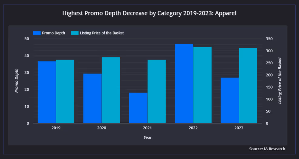 The COVID pandemic-induced inventory glut has largely dissipated, enabling apparel discounts to revert to the mean: Apparel promo depth dropped ~40 percent compared to Prime Day 2022, albeit on very high base prices, which stayed fairly flat after their sharp, more than 20 percent increase last year.